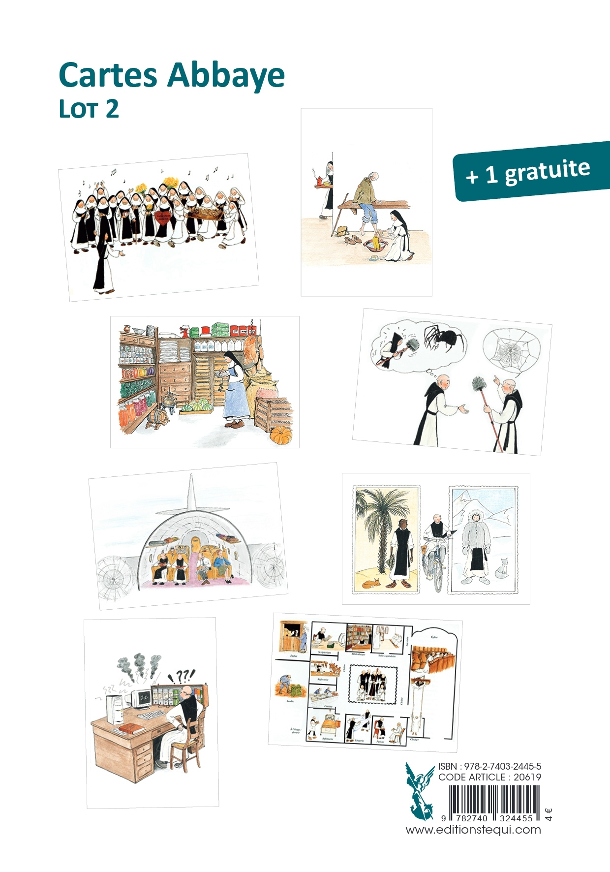 Série de 8 cartes humoristiques sur les activités quotidiennes de la vie monastique : ménage, soin aux malades… anniversaires et les immanquables problèmes informatiques !