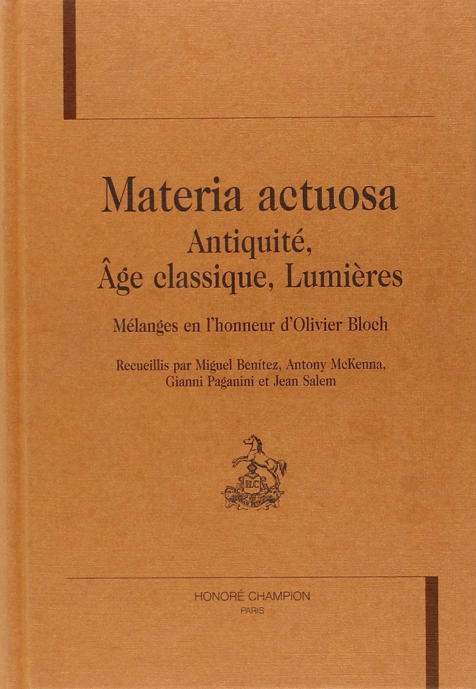 Olivier Bloch travaille sur l'histoire de la philosophie, et plus particulièrement sur l'histoire des doctrines, courants et traditions matérialistes, dans le domaine de la philosophie antique et dans celui de la philosophie de l'âge classique (XVIIe et XVIIIe siècles), en particulier en France (Descartes, Gassendi et ses disciples, les philosophes matérialistes du XVIIIe siècle), et en Grande-Bretagne (Hobbes). Depuis le début des années 80, ses recherches portent principalement sur les traditions libertines et clandestines de l'âge classique et leur prolongement dans le matérialisme des Lumières, et, dans cette perspective, sur les rapports entre matérialisme et littérature, avec un intérêt tout particulier pour Cyrano de Bergerac, puis Molière. Ses collègues ont voulu lui rendre hommage par ce recueil d'études sur ses domaines de prédilection.