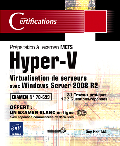 L'examen MCTS 70-659 ""Virtualisation serveur avec Windows Server 2008 R2"" est l'un des examens requis pour l'obtention de la certification MCITP Administration de la virtualisation avec Windows Server 2008 R2. Avec cette certification vous prouvez votre expertise en tant qu'administrateur de la virtualisation dans les environnements Windows Server 2008 R2 qui couvrent Microsoft Hyper-V Server 2008 et Hyper-V Server 2008 R2. Pour vous aider à préparer efficacement l'examen, ce livre couvre tous les objectifs officiels, tant d'un point de vue théorique que d'un point de vue pratique. Il a été rédigé en français (il ne s'agit pas d'une traduction) par un formateur professionnel reconnu, également consultant, certifié techniquement et pédagogiquement (MCT) par Microsoft. Ainsi, les savoir-faire pédagogique et technique de l'auteur conduisent à une approche claire et visuelle, d'un très haut niveau technique. Chapitre après chapitre, vous pourrez valider vos acquis théoriques, à l'aide d'un grand nombre de questions-réponses (132 au total) mettant en exergue aussi bien les éléments fondamentaux que les caractéristiques spécifiques aux concepts abordés. Chaque chapitre s'achevant par des travaux pratiques (31 au total) vous aurez les moyens de mesurer votre autonomie. Ces manipulations concrètes, au-delà même des objectifs fixés par l'examen, vous permettront de vous forger une première expérience significative et d'acquérir de véritables compétences techniques sur des mises en situations réelles. Des éléments complémentaires sont en téléchargement sur le site www.editions-eni.fr. Pour la préparation spécifique à la certification, vous pourrez accéder gratuitement à 1 examen blanc en ligne, destiné à vous entraîner dans des conditions proches de celles de l'épreuve. Sur ce site, chaque question posée s'inscrit dans l'esprit de la certification et, pour chacune, les réponses sont suffisamment commentées pour combler ou identifier vos ultimes lacunes. à vous de juger quand vous serez prêt pour l'examen final ! Les chapitres du livre : Descriptif - Introduction à la virtualisation - La solution Hyper-V - Déploiement d'Hyper-V R2 - Hyper-V et le réseau - Hyper-V et le stockage - Administration à partir de la partition parent - Mise en œuvre de la haute disponibilité - Administration de cluster - Déploiement de Virtual Machine Manager - Gestion d'Hyper-V avec SCVMM - Optimisation et performance - Sauvegarde et restauration sous Hyper-V - Infrastructure de bureau virtuel - Hyper-V avec Windows Server 2008 R2 en mode core - Fonctionnalités de Windows Server 2008 R2 Hyper-V SP1