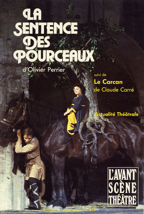 La Sentence des pourceaux : (Olivier Perrier) L’empire romain s’effondre, cerné par les barbares. Un dieu singulier ruine les dieux multiples. Droit écrit et droit coutumier s’affrontent. Les langues se corrompent. Le préfet Ausone se heurte à tous les conflits et dans cette tourmente, même les animaux, les pourceaux interviennent. Une fable médiévale qui fait la part belle aux animaux : moutons, chevaux, truie, pourceaux... (durée : 2 heures - 5 hommes / 3 femmes) Le Carcan : (Claude Carré) Athor porte un carcan. Quel crime a-t-il commis ? Juddha essaye de la distraire, mais la compassion ne suffit pas. Chacun semble être prisonnier, mais de qui ? mais de quoi ? Athor persuade Juddha qu’il est lui aussi prisonnier. Puisqu’il faut payer un jour pourquoi attendre ? (durée : 1 heure et 15 minutes - 1 homme / 1 femme)