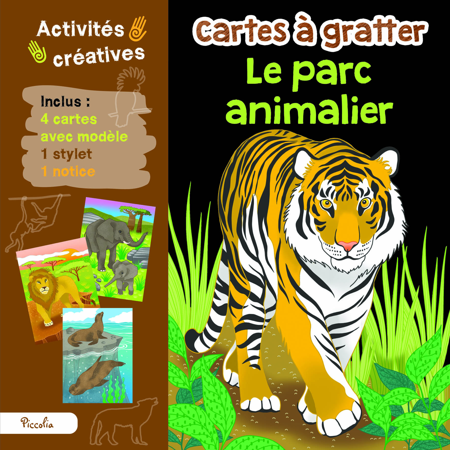 Une pochette de 4 cartes à gratter avec stylet et notice pas à pas sur le thème du parc animalier. Il suffit de gratter l’encre noire avec le stylet pour faire apparaître de magnifiques illustrations aux couleurs de l’arc-en-ciel. Une activité détente pour réaliser de jolies décorations. La pochette est munie d'une attache pour la suspendre.