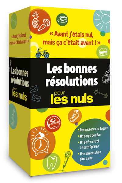 La première boîte à fiches de développement personnel pour les Nuls : pour un coaching et de la bonne humeur toute l'année ! Cette année, vous allez vous réformer en profondeur avec les Nuls ! Une boîte avec 5 rubriques différentes de fiches pratiques pour envisager l'année à venir avec sérénité et se fixer des challenges réguliers : Je deviens zen avec des exercices pratiques ; Je muscle mes neurones avec des jeux de mémoire ; Je me cultive avec des sagesses du monde entier ; Je me sculpte un corps de rêve avec un peu de sport ; Je mange sain avec des recettes délicieuses . Et en bonus : un carnet pour noter vos challenges chaque mois !