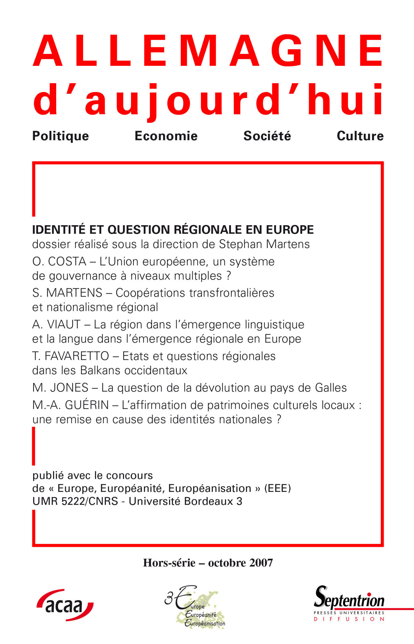 ALLEMAGNE D'AUJOURD'HUI, N HORS SERIE/OCT. 2007. IDENTITE ET QUESTION S REGIONALES EN EUROPE