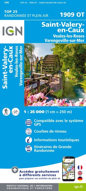 L'indispensable carte de randonnée IGN 1909OT. D'une très grande précision elle contient tous les détails existants sur le terrain : voies de communication jusqu'au moindre sentier, constructions jusqu'au hangar, bois, arbre isolé, rivière, source... Sans oublier la représentation du relief par des courbes de niveau. Les sentiers balisés et les informations touristiques sont également représentés. Communes couvertes : Saint-Valery-en-Caux, Veules-les-Roses, Thil-Manneville, Drosay, Brametot, Saint-Laurent-en-Caux, Auzouville-sur-Saâne, Ocqueville, Fultot, Brachy, Avremesnil, Gruchet-Saint-Siméon, Colmesnil-Manneville, Gonnetot, Saint-Aubin-sur-Mer, Greuville, Sotteville-sur-Mer, Saint-Mards, Bénesville, Varengeville-sur-Mer. Lieux à découvrir : le Bois des Moutiers, Château de Catteville, Manoir d'Ango, Château d'Arnouville, Phare d'Ailly, Château de Galleville, Monastère Costes et Bellonte, Jardin de Miromesnil Dimensions : 98 cm x 66 cm