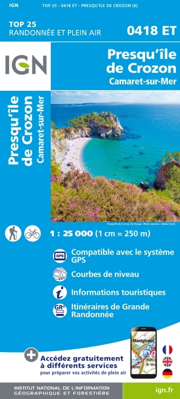 L'indispensable carte de randonnée IGN 0418ET. D'une très grande précision elle contient tous les détails existants sur le terrain : voies de communication jusqu'au moindre sentier, constructions jusqu'au hangar, bois, arbre isolé, rivière, source... Sans oublier la représentation du relief par des courbes de niveau. Les sentiers balisés et les informations touristiques sont également représentés.Communes couvertes : Crozon, Camaret-sur-Mer, Landévennec, Plougastel-Daoulas, Roscanvel, Telgruc-sur-Mer, LanvéocLieux à découvrir : Parc naturel régional d'Armorique,Anse de Poulmic, Rade de Brest, Pointe des Espagnols, les Tas de Pois, Pointe de Pen-Hir, Pointe du Petit Minou, Cap de la Chèvre, Pointe de Dinan, Presqu'île de Crozon, Notre-Dame de Roc'h Amadour, St-Fiacre, Tour Vauban, Pointe des Grottes Dimensions : 96 cm x 132 cm