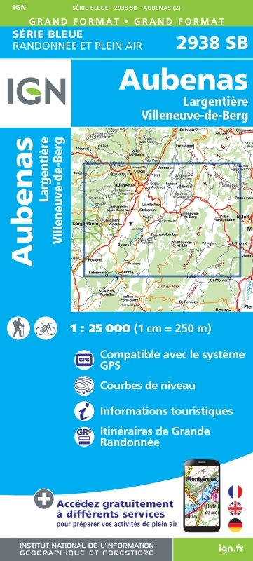 L'indispensable carte de randonnée IGN 2938SB. D'une très grande précision elle contient tous les détails existants sur le terrain : voies de communication jusqu'au moindre sentier, constructions jusqu'au hangar, bois, arbre isolé, rivière, source... Sans oublier la représentation du relief par des courbes de niveau. Les sentiers balisés et les informations touristiques sont également représentés.Communes couvertes : Aubenas, Villeneuve-de-Berg, Labégude, Lentillères, Chazeaux, Lanas, Lachapelle-sous-Aubenas, Rocher, Lalevade-d'Ardèche, Fons, Saint-Maurice-d'Ardèche, Pradons, Chassiers, Lavilledieu, Saint-Germain, Ucel, Tauriers, Lussas, Larnas, Ailhon, Sceautres, Rosières, Rochecolombe, LargentièreLieux à découvrir : Parc Naturel Régional des Monts d'Ardèche, le Gras, Gorges de la Ste-Beaume, Défilés de Ruoms, Plateaux des Gras, Plateaux du Vivarais, Plateau du Laoul, Montagne de Berg, Chaîne du Coiron,Village Féodal, Roseraie de Berty, Lamothe, St-Benoît, Montlaur, Oppidum de Jastres, HabitationsTroglodytiques Balmes de Montbrun, les PommiersDimensions : 143 cm x 96 cm