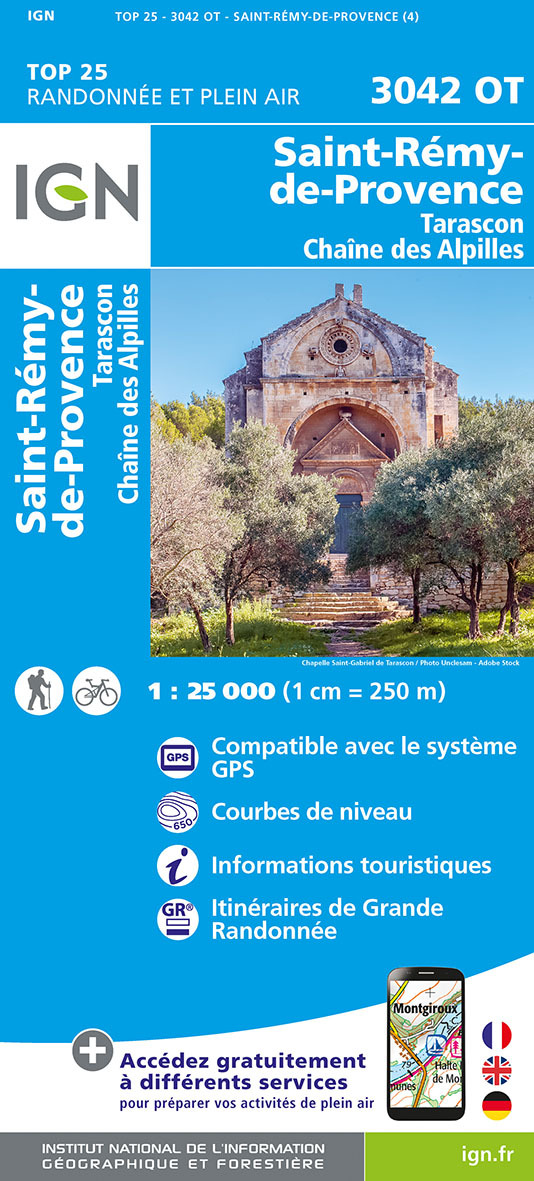 L'indispensable carte de randonnée IGN 3042OT. D'une très grande précision elle contient tous les détails existant sur le terrain : voies de communication et sentiers, constructions y compris les hangars, bois, arbres isolés, rivières, sources, sans oublier la représentation du relief par des courbes de niveau. Les sentiers balisés et les informations touristiques sont également représentés.Communes couvertes : Tarascon, Saint Remy de Provence, Chaîne des Alpilles, Graveson, Eygalières, Maussane-les-Massif des Alpilles, Orgon, Noves, Plan-d'Orgon, Eyragues, Saint-Andiol, Maillane, Rognonas, Barbentane, Cabannes, Saint-Étienne-du-Grès, Mollégès, Caumont-sur-Durance, Boulbon, Saint-Pierre-de-MézoarguesLieux à découvrir : Massif des Alpilles, Massif du Lubéron,Plateau de la Caume, Rochers d'Entreconque, Chaîne des Massif des Alpilles, la Montagnette,St-Marcellin, Château royal, Mas de la Brune, Ste-Croix, Maison du Parc, Château d'Estoublon, Massif de la Chartreuse de Bonpas, Tour du Cardinal, Site Antique de Glanum, Table d'orientation, Abbaye St-Michel de Frigolet, Château de Roussan, St-MartinDimensions : 96 cm x 143 cm