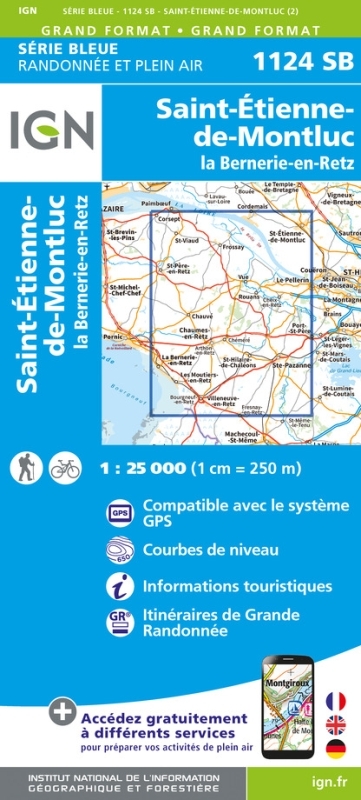 L'indispensable carte de randonnée IGN 1124SB. D'une très grande précision elle contient tous les détails existant sur le terrain : voies de communication et sentiers, constructions y compris les hangars, bois, arbres isolés, rivièress, sources. Sans oublier la représentation du relief par des courbes de niveau. Les sentiers balisés et les informations touristiques sont également représentés.Communes couvertes : La Bernerie-en-Retz, Saint-Brevin-les-Pins, Préfailles, La Bernerie-en-Retz, Saint-Michel-Chef, Pornic, La Plaine-sur-Mer, Rouans, Villeneuve-en-Retz, Les Moutiers-en-Retz, Frossay, Chaumes-en-Retz, Saint-Étienne-de-Montluc, Saint-Père-en-Retz, Le Pellerin, Cheix-en-Retz, Sainte-Pazanne, Saint-Mars-de-Coutais, Saint-Hilaire-de-Chaléons, Chauvé, Saint-ViaudLieux à découvrir : Marais de Vue, Marais de l'Acheneau, Baie de Bourgneuf, la Belle Île,Chapelle de Prigny, Lanterne des MortsDimensions : 96 cm x 121 cm