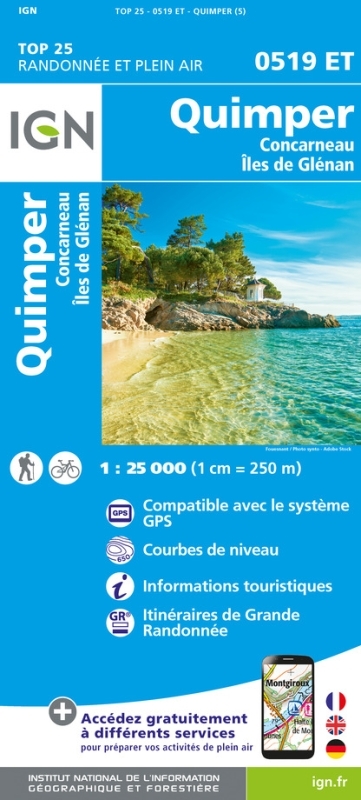 L'indispensable carte de randonnée IGN 0519ET. D'une très grande précision elle contient tous les détails existant sur le terrain : voies de communication et sentiers, constructions y compris les hangars, bois, arbres isolés, rivièress, sources. Sans oublier la représentation du relief par des courbes de niveau. Les sentiers balisés et les informations touristiques sont également représentés.Communes couvertes : Fouesnant, Concarneau, Quimper, Trégunc, La Forêt-Fouesnant, Bénodet, Pleuven, Elliant, Saint-Yvi, Gouesnach, Melgven, Ergué-Gabéric, Saint-Évarzec, Clohars-FouesnantLieux à découvrir : Baie de Kérogan, Anse de Bénodet,,Île aux Moutons, Pointe de Mousterlin, Îles de Glénan, Pointe du Cabellou,Site des Vire-Court, Château de Keriolet, Calvaire, le Stangala, Phare de la Croix, Réserve Naturelle de St-Nicolas-de-Glénan, Ville Close, St-Cadou, Château de Cheffontaines, Château Lanniron, Ste-AnneDimensions : 96 cm x 132 cm
