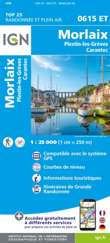 L'indispensable carte de randonnée IGN 0615ET. D'une très grande précision elle contient tous les détails existant sur le terrain : voies de communication et sentiers, constructions y compris les hangars, bois, arbres isolés, rivièress, sources. Sans oublier la représentation du relief par des courbes de niveau. Les sentiers balisés et les informations touristiques sont également représentés.Communes couvertes : Plouigneau, Tréduder, Saint-Martin-des-Champs, Lanmeur, Henvic, Locquénolé, Plufur, Plouégat-Moysan, Saint-Michel-en-Grève, Plestin-les-Grèves, Trédrez-Locquémeau, Guimaëc, Saint-Jean-du-Doigt, Garlan, Morlaix, Plouezoc'h, Plougasnou, Taulé, Roscoff, CarentecLieux à découvrir : Parc naturel régional d'Armorique, Rade de Morlaix, Baie de Lannion, Baie de Morlaix, Baie de Morlaix, Baie de Lannion, Île Callot, Pointe de Primel, Pointe de Penn-al-Lann, Pointe de Bihit, le Grand-Rocher, Pointe de Séhar, Château de Kermerzit, Ste-Barbe, Château de Kernévez, Château de Penhoat, Chapelle Ste-Anne, Calvaire, Cairn de Barnenez, Château de Rosanbo, Ste-Geneviève, Château du Taureau, Notre-Dame des Joies, Jardin Georges Delaselle, KeranrouxDimensions : 96 cm x 132 cm