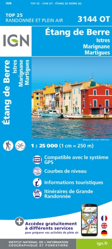 L'indispensable carte de randonnée IGN 3144OT. D'une très grande précision elle contient tous les détails existants sur le terrain : voies de communication jusqu'au moindre sentier, constructions jusqu'au hangar, bois, arbre isolé, rivière, source... Sans oublier la représentation du relief par des courbes de niveau. Les sentiers balisés et les informations touristiques sont également représentées.Communes couvertes : Etang de Berre, Istres, Martigues, Marignane, Saint-Mitre-les-Remparts, Berre-l'Étang, Ensuès-la-Redonne, Rognac, Port-de-Bouc, Carry-le-Rouet, Châteauneuf-les-Martigues, Saint-Chamas, Gignac-la-Nerthe, Sausset-les-PinsLieux à découvrir : Étang de Bolmon, Étang de Berre,Chaîne de l'Estaque, Cap Couronne,Château de Crans, Abbaye de Bonmont, Cabane du Carroz, Sapins de Borsattaz, Saut du Day, Grotte de Réclère, Cabane les Pralets, Cabane Rochefort, Signal de Roche d'Or, Cabane Trois Chalets, Chalet de la Dent de Vaution, Résurgence de l'OrbeDimensions : 96 cm x 121 cm