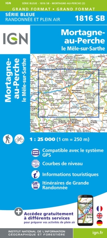 L'indispensable carte de randonnée IGN 1816SB. D'une très grande précision elle contient tous les détails existants sur le terrain : voies de communication jusqu'au moindre sentier, constructions jusqu'au hangar, bois, arbre isolé, rivière, source... Sans oublier la représentation du relief par des courbes de niveau. Les sentiers balisés et les informations touristiques sont également représentées.Communes couvertes : Mortagne,Le Mêle-Sur-Sarthe Contilly, La Chapelle-Montligeon, Parfondeval, Saint-Denis-sur-Huisne, Vidai, Saint-Julien-sur-Sarthe, Les Aulneaux, Pervenchères, Sainte-Scolasse-sur-Sarthe, Loisail, Le Mêle-sur-Sarthe, Réveillon, Coulonges-sur-Sarthe, Boëcé, Saint-Aubin-d'Appenai.Lieux à découvrir : Parc naturel régional du Perche, Parc naturel régional Normandie-Maine, Forêt de Réno-Valdieu, Forêt Domaniale du Parc naturel régional du Perche, Manoir de la Vove, Manoir de la Moussetière, Notre-Dame, Manoir de Vauvineux, Manoir de la Pellonière, Manoir de Chanceaux, Manoir du Pontgirard.Dimensions : 96 cm x 121 cm