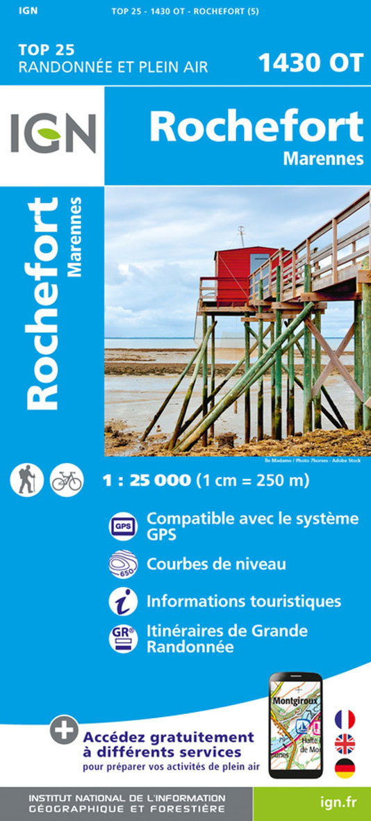L'indispensable carte de randonnée IGN 1430OT. D'une très grande précision elle contient tous les détails existants sur le terrain : voies de communication jusqu'au moindre sentier, constructions jusqu'au hangar, bois, arbre isolé, rivière, source... Sans oublier la représentation du relief par des courbes de niveau. Les sentiers balisés et les informations touristiques sont également représentés. Communes couvertes : Châtelaillon-Plage, Fouras, Rochefort, Île-d'Aix, Yves, Marennes-Hiers-Brouage, Champagne, Saint-Jean-d'Angle, Ballon, Ciré-d'Aunis, Beaugeay, Moëze, Saint-Agnant, Soubise, Trizay, Saint-Froult, Échillais, Bourcefranc-le-Chapus, Saint-Hippolyte, Saint-Laurent-de-la-Prée, Port-des-Barques Lieux à découvrir : Rade des Basques, Île Madame, Côte de Piédemont, Pointe de la Fumée, Pointe St-Clément, Île d'Aix, Château de la Gataudière, Croix Hosannière, Réserve naturelle du Marais d'Yves, Fort Louvois, Maison de Pont Loti Dimensions : 96 cm x 121 cm