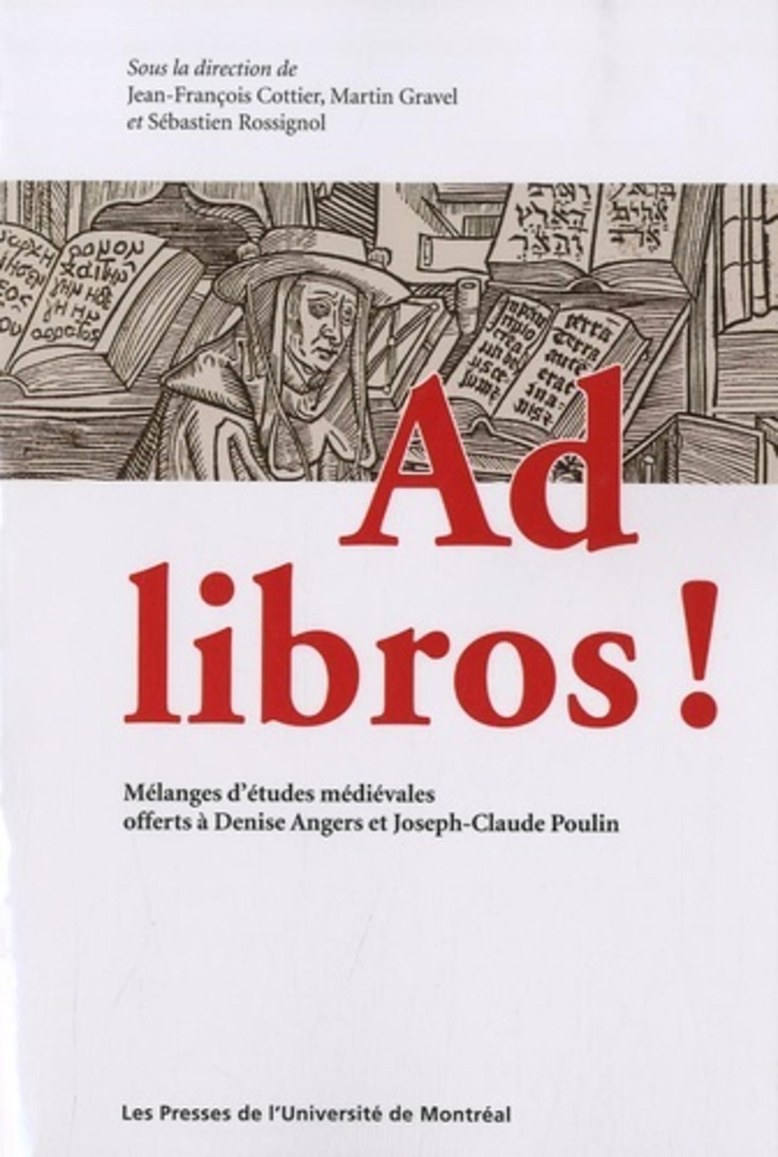 Ad libros ! "Aux livres !", ce cri attribué à dom Guillaume de Raynald au moment où le feu ravageait la Grande Chartreuse lors de l'incendie de 1371 est à la fois une injonction et un élan que tout médiéviste peut reprendre à son compte : élan du chercheur vers ses sources, injonction du professeur à ses élèves. Ces deux mots latins, qui ont servi de devise à Denise Angers et Joseph-Claude Poulin, forment donc un titre idéal pour des mélanges qui célèbrent ce couple d'humanistes passionnés. Ce mantra est aussi un credo qui explique toute l'importance que Denise Angers et Joseph-Claude Poulin ont accordée dans leur pédagogie à cet aspect de la formation des jeunes médiévistes à Ottawa, à Québec ou à Montréal : cours sur les sources, introduction à la paléographie, à la codicologie ou à l'archéologie médiévale. Les études qui sont réunies dans ce livre rendent hommage à leur irréprochable engagement scientifique, dans un bouquet de contributions qui embrassent l'ensemble du Moyen Âge, du VIIIe au XVe siècle - avec une avancée jusqu'en Nouvelle-France -, mais dont le point commun réside dans l'attention aux sources.