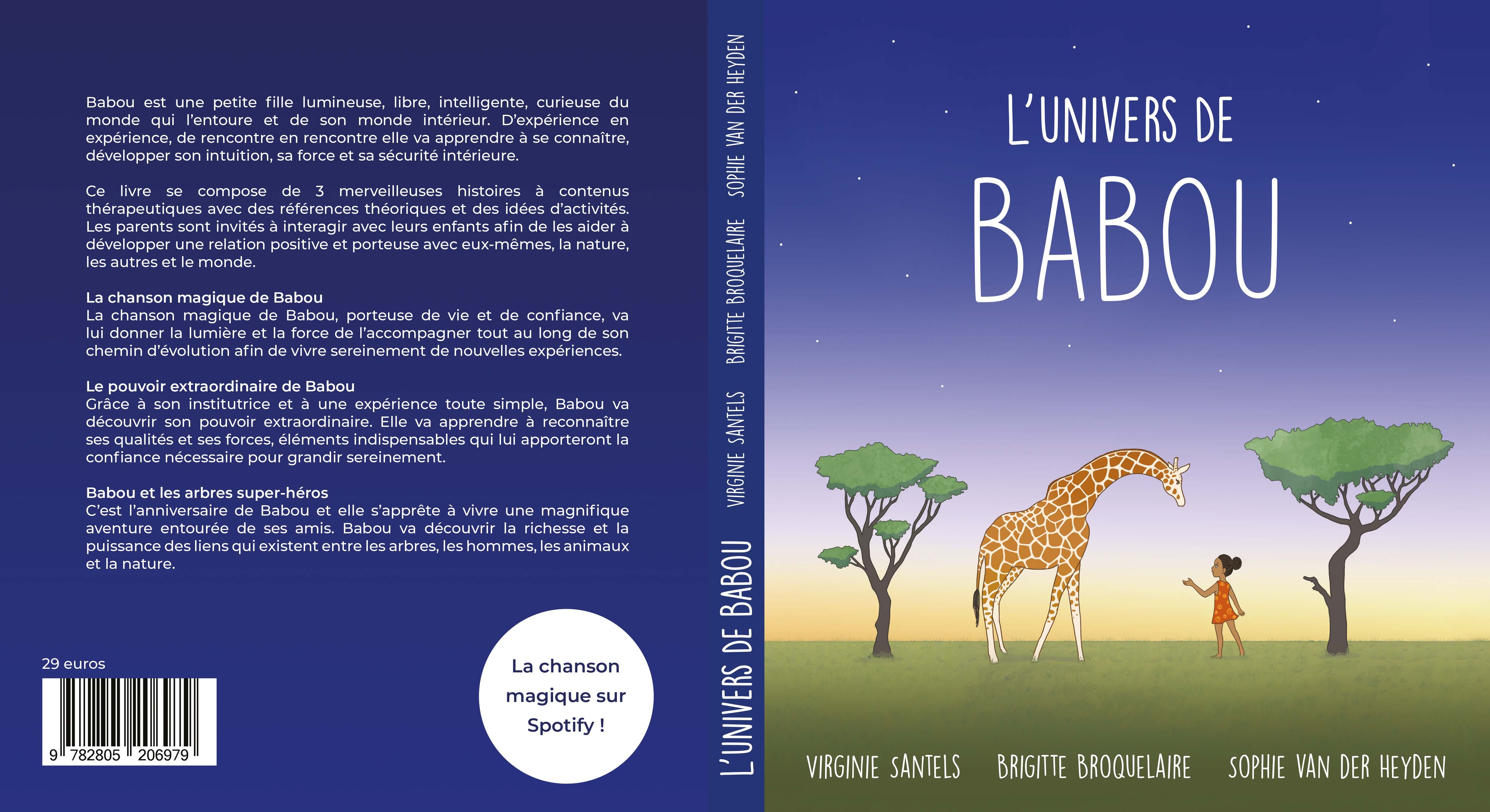 Babou est une petite fille lumineuse, libre , intelligente, curieuse du monde qui l’entoure et de son monde intérieur. D’expérience en expérience, de rencontre en rencontre elle va apprendre à se connaître, développer son intuition, sa force et sa sécurité intérieure. « L’univers de Babou » est un livre pour les enfants de 5 à 10 ans et leurs parents. Ce livre, avec Babou comme héroine, se compose de trois merveilleuses histoires destinées à aider les enfants à développer une relation positive et porteuse avec eux-mêmes, les autres et la nature. Pour les parents, chaque histoire est accompagnée de références théoriques et des idées d’activités conseillées par Brigitte Broquelaire, psychologue pour enfants. Un QR code dans le livre vous amène dans l’univers musical de Babou. La chanson magique de Babou La chanson magique de Babou, porteuse de vie et de confiance, va lui donner la lumière et la force de l’accompagner tout au long de son chemin d’évolution afin de vivre sereinement de nouvelles expériences. Le pouvoir extraordinaire de Babou Grâce à son institutrice et à une expérience toute simple, Babou va découvrir son pouvoir extraordinaire. Elle va apprendre à reconnaître ses qualités et ses forces, éléments indispensables qui lui apporteront la confiance nécessaire pour grandir sereinement. Babou et les arbres super-héros C’est l’anniversaire de Babou et elle s’apprête à vivre une magnifique aventure entourée de ses amis. Babou va découvrir la richesse et la puissance des liens qui existent entre les arbres, les hommes, les animaux et la nature.
