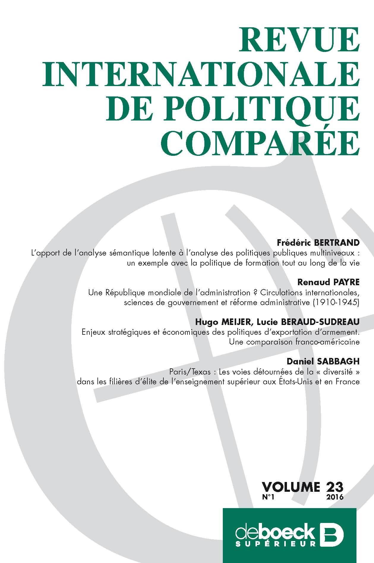 Frédéric BERTRAND : L’apport de l’analyse sémantique latente à l’analyse des politiques publiques multiniveaux : un exemple avec la politique de formation tout au long de la vie / Renaud PAYRE : Une République mondiale de l’administration ? Circulations internationales, sciences de gouvernement et réforme administrative (1910-1945) / Hugo MEIJER, Lucie BERAUD-SUDREAU : Enjeux stratégiques et économiques des politiques d’exportation d’armement. Une comparaison franco-américaine / Daniel SABBAGH : Paris/Texas : Les voies détournées de la « diversité » dans les filières d’élite de l’enseignement supérieur aux États-Unis et en France.