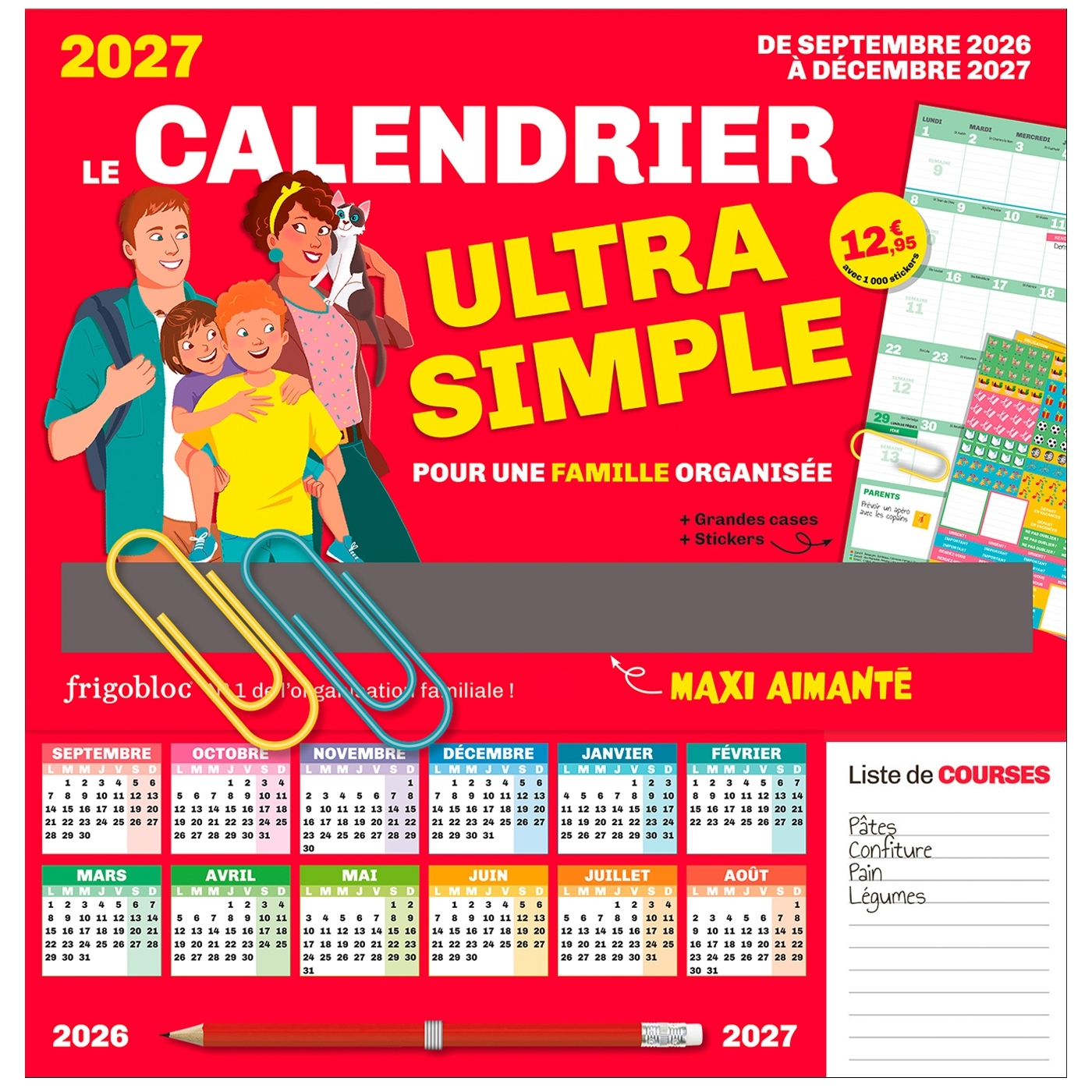 FRIGOBLOC©, CHOISISSEZ L'ORIGINAL ! N°1 des ventes de calendriers familiaux ! Le calendrier qui tient sur TOUS les frigos ( même bombés ) grâce à ses maxi aimants déjà intégrés ! Avec les dates officielles des vacances scolaires ! Plus simple, ça n'existe pas ! Un calendrier familial sans froufrou pour organiser toute son année de septembre 2026 à décembre 2027 (16 mois). 2 pages par mois, de très grandes cases pour tout noter, un espace dédié aux priorités du mois, une zone mémo pour les parents, une zone mémo pour les enfants... l'essentiel et c'est tout ! Avec en bonus : - 1 pochette de rangement, - 2 maxi-trombones, - 1 000 stickers colorés, - 1 bloc listes de courses, - Des fiches pratiques pour gérer le quotidien (emplois du temps, mémo anniversaires, numéros d'urgences), - 1 calendrier annuel, - 1 crayon à papier et son élastique pour le fixer. S'organiser n'a jamais été aussi simple !
