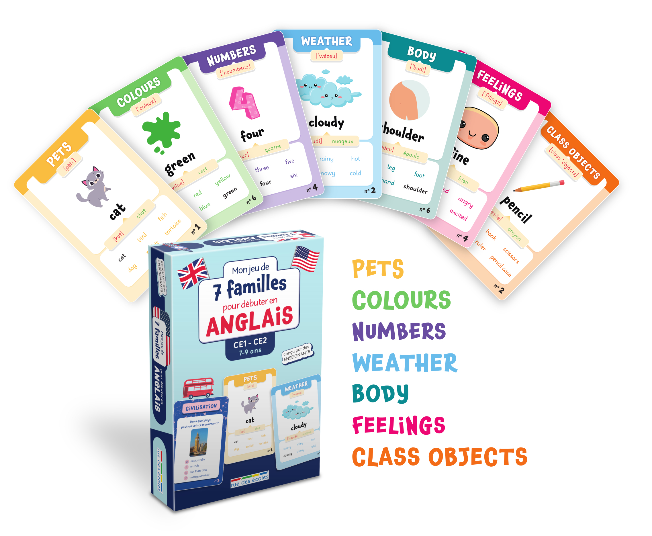 Un outil ludique et pédagogique pour accompagner l’apprentissage du vocabulaire anglais, à destination des élèves de CE1-CE2. 49 cartes pour découvrir la langue anglaise ! Ce jeu de 7 familles se compose 42 cartes illustrées abordant les principales thématiques au programme : animaux de compagnie, parties du corps, nombres, sentiments, météo, couleurs et objets de la classe, ainsi que 7 cartes « défi » portant sur des questions de civilisation. La transcription phonétique simplifiée et le mini-site dédié permettent à l'enfant de consolider sa prononciation anglaise. Aussi, le livret pédagogique propose des phrases types pour l'inviter progressivement à mener des parties dans cette langue. Contenu : 49 cartes avec les familles « pets », « body », « numbers », « feelings », « weather », « colours » et « class objects » et des cartes « civilisation » Un livret de 16 pages avec un QR code pour s'exercer à la prononciation