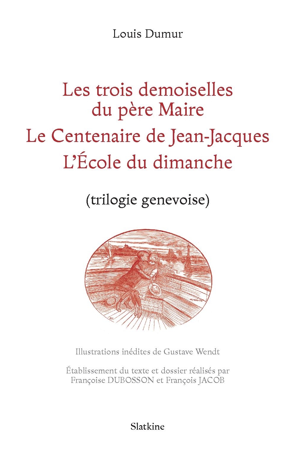 C'est entre 1909 et 1911 que Louis Dumur publie ce qu'on a l'habitude de nommer sa trilogie genevoise, à savoir trois romans respectivement intitulés Les trois demoiselles du père Maire, Le Centenaire de Jean-Jacques et L'École du dimanche. Le lecteur y suit, plusieurs années durant, les aventures du jeune Nicolas Pécolas, héros et narrateur, élève du collège Calvin à la fin de la décennie 1870. Autour de ce garçon des Rues-Basses gravitent des personnages tantôt rassurants (la mère Maire, le cousin Gobernard), tantôt inquiétants (le pasteur Babel, la tante Bobette). Il y est naturellement question d'amour (le jeune Nicolas tombant amoureux d'Églantine, la propre nièce du pasteur) et de religion. La critique contre toute forme d'hypocrisie religieuse est d'ailleurs ce qui ressort, non sans un humour parfois caustique, des trois romans, et en particulier du dernier, L'École du dimanche. Que Dumur ait dû se défendre des nombreuses attaques dont il fut l'objet, allant jusqu'à publier un opuscule intitulé Les enfants et la religion n'est pas pour surprendre : l'écrivain défend en effet, au travers de personnages qui empruntent leur discours à la Profession de foi du vicaire savoyard, voire ¿ horresco referens ¿ à Voltaire, une forme assumée d'agnosticisme. Mais ce qui l'emporte surtout, c'est la fraîcheur des scènes décrites, qui nous replongent dans l'atmosphère des Rues-Basses, à Genève, il y a quelque cent quarante ans. Une fraîcheur non dénuée d'humour, et toujours empreinte d'un optimisme qui ne s'émoussera, une fois la trilogie parue, qu'au son des canons de la Grande Guerre.
