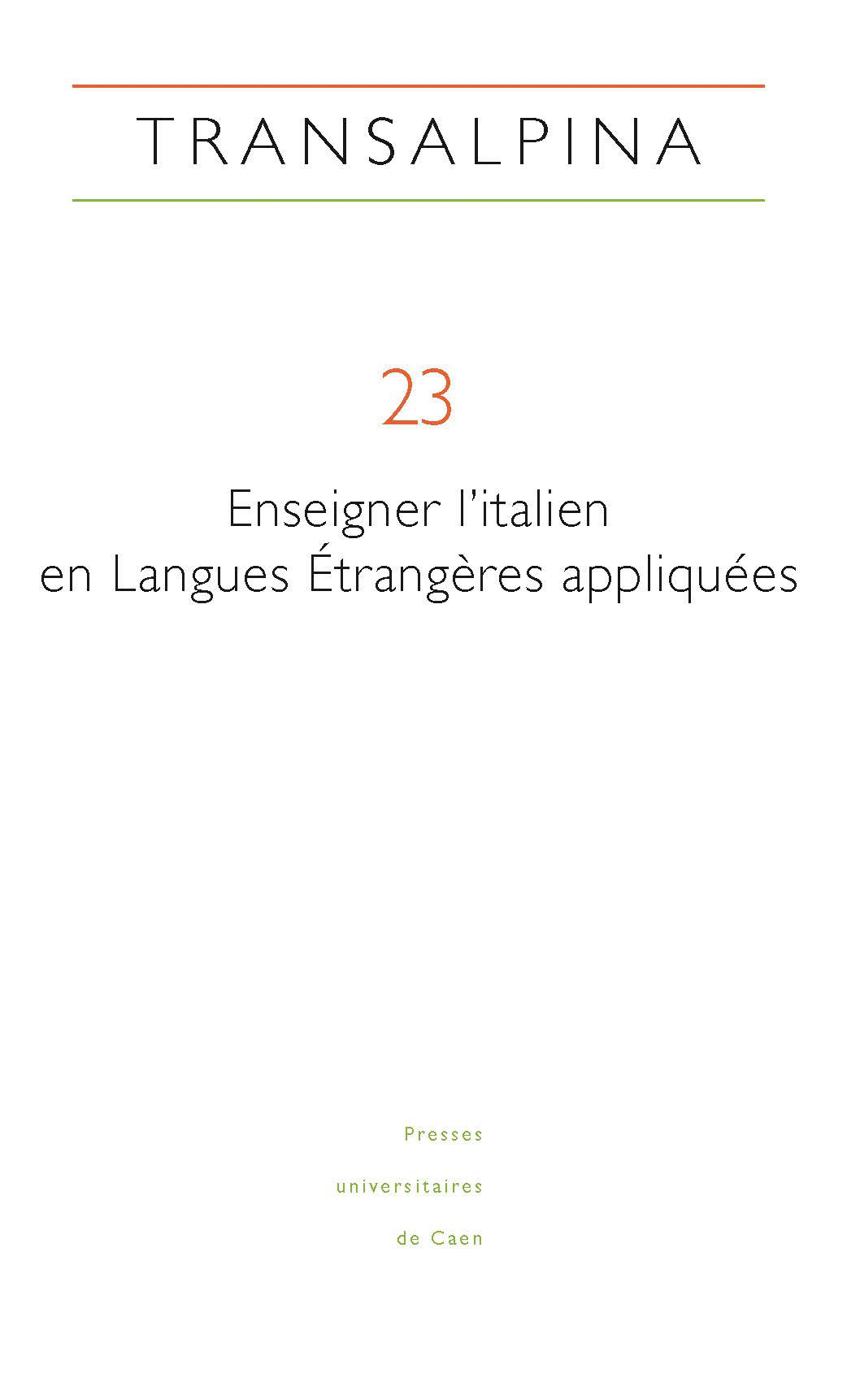 Ce volume de Transalpina, consacré à l'enseignement universitaire de l’italien en Langues Étrangères Appliquées (LEA), a pour but de présenter les enjeux inhérents à l'enseignement de la langue italienne dans ce cursus, au sein duquel la langue interagit avec des disciplines telles que l’économie, la géopolitique et le droit. Les articles de ce numéro ont pour vocation de fournir des repères aux enseignants qui doivent se former et s’adapter aux objectifs professionnalisants de cette filière. Il combine ainsi des analyses sur les contenus et sur les formats des cours, tout en abordant les problématiques italiennes contemporaines, les spécificités disciplinaires et leurs enjeux idéologiques. Il est par ailleurs doté d’une bibliographie thématique substantielle qui dresse un état des lieux des références éditoriales et d’une sitographie.