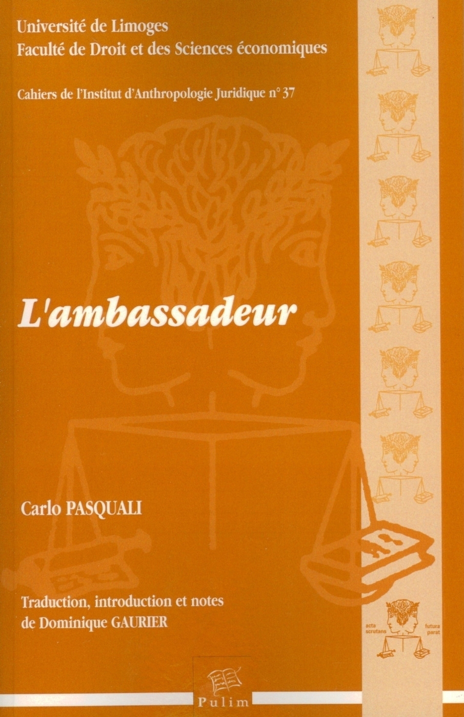 Dominique Gaurier poursuit avec cet ouvrage le travail de mise à disposition des textes des auteurs classiques du droit international qu'il avait commencé à proposer aux PULIM. Avec Carlo Pasquali, il revient au droit des ambassades qui avait commencé cette série de traduction.Pasquali, d'origine italienne, avait été anobli par le roi de France pour avoir rempli ses missions diplomatiques à la pleine satisfaction du pouvoir royal. L'ouvrage qu'il a composé sur l'ambassadeur se présente comme un ouvrage destiné à plaire au public plus que comme un véritable ouvrage technique. Cependant, ces aspects ne sont pas non plus absents et donnent en tout cas à l'auteur l'occasion de faire valoir son excellente culture classique tant des auteurs grecs que latins. L'ouvrage compte parmi les quelques qui ont été consacrés au droit des ambassades, chacun ayant à la fois ses qualités propres et ses inconvénients.