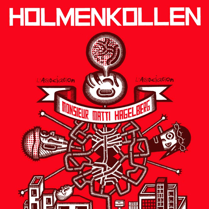 Holmenkollen (du nom d'une célèbre station balnéaire Scandinave), est le premier livre du Finlandais Matti Hagelberg en français, après un mini-format chez Chacal Puant et plusieurs publications dans LAPIN Première formule. On y croise (à la carte à gratter) des personnages célèbres comme l'architecte Alvar Aalto… ou le commandant Cousteau, qui apparaît soudain dans la baignoire d’une ménagère bien ennuyée.