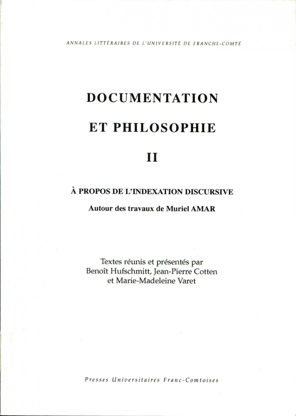 Pour répondre aux difficultés que posent les pratiques d'indexation documentaire, le CDBP tente, depuis plusieurs années, d'installer de nouvelles orientations, au niveau spécifique des écrits de philosophie. Il rencontre en 2000, Muriel Amar qui a soutenu en 1997 une thèse propre à bouleverser les approches documentaires. Les Fondements théoriques de l'indexation : une approche linguistique (publiée en 2000, Paris, ADBS Editions). Un dialogue critique se développe autour de la notion « d'indexation discursive » et de manière plus générale sur les principes et les finalités de l'indexation. Une seconde partie, plus brève regroupe un article sur la question du multilinguisme en documentation et quelques notes de lecture.