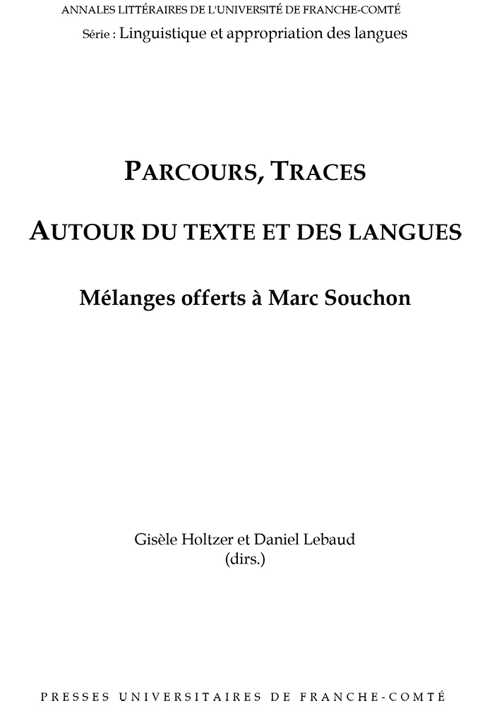 Cheminements singuliers de chercheurs en sciences du langage qui se rassemblent pour un hommage à Marc Souchon, et, de, par son parcours et les traces qui le jalonnent, se retrouvent autour du texte, du texte et de l'image, du texte, et de la recherche, de l'écriture, de l'oralité, du scriptural, des langues,de leurs enseignements et de leur appropriation.
