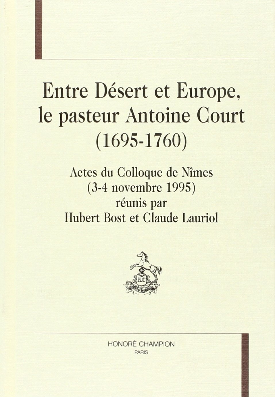 Entre Désert et Europe, le pasteur Antoine Court (1695-1760) - actes du colloque de Nîmes, 3-4 novembre 1995