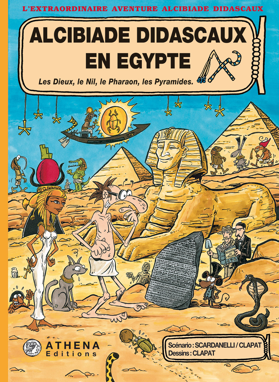 Sur les traces de Champollion, Alcibiade Didascaux se rend en Egypte afin de retrouver les racines de notre civilisation. L’hellénisme qui nous a tant apporté doit en fait beaucoup à l’Egypte. Notre professeur de Lettres en est convaincu et il souhaite communiquer son savoir à ses élèves. Notre sympathique héros est cette fois-ci parvenu à échapper à l’inquiétante machine à remonter le temps de son collègue de Physique, Agénor. Mais voilà que dans le désert, Alcibiade rencontre un étrange égyptologue qui lui offre un fort curieux cigare. Notre héros se trouve alors mystérieusement projeté dans les méandres du temps et découvre avec nous le panthéon de la mythologie égyptienne. Il assiste émerveillé à la naissance du monde et revit l’histoire de Rê le dieu soleil, la légende d’Isis et Osiris, le combat éternel entre Horus, les forces de la lumière, contre Seth, les forces des ténèbres et du désordre cosmique. Parcourant peu après le monde fabuleux des pharaons, Alcibiade Didascaux découvre les bienfaits du Nil nourricier et nous explique pourquoi l’Egypte est un don du Nil. Il participe à la construction des pyramides, nous dévoile le sens de ces tombeaux et fait un voyage au pays des morts. Ce premier tome se termine avec l’étrange histoire du livre magique de Thot, que nul ne doit lire.