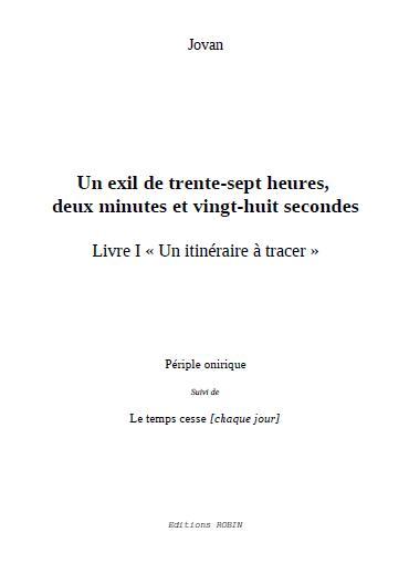 « Un exil de trente-sept heures, deux minutes et vingt-huit secondes » Livre I « Un itinéraire à tracer » Est-ce possible de décrire sa propre vie? Son propre monde? Garderez-vous de vos tristes heures un souvenir mémorable? La vie, éphémère, et la belle symphonie du temps qui passe ne sont qu’idylle. Une route. Un itinéraire à tracer. De cet exil, tout deviendra limpide. Le voyage parcouru, le bond accompli, il vous faudra accepter la fin. Mais elle reste difficile à concevoir, et le temps qui cesse, chaque jour, est quand même préférable. Et ce pour la pérennité de tous vos rêves.