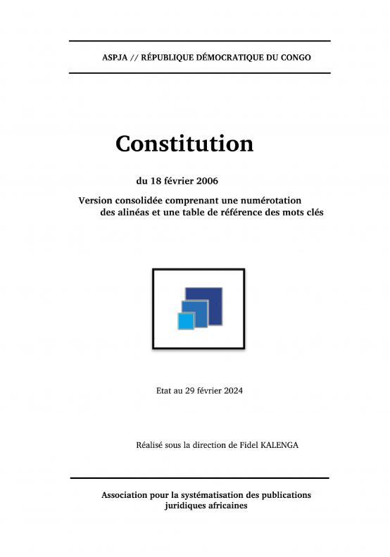 Constitution de la République démocratique du Congo du 18 février 2006. Version consolidée comprenant une numérotation des alinéas des articles de la Constitution congolaise ainsi qu'une table de références des mots clés des matières. Cette version de la Constitution est spécialement conçue pour faciliter le travail de recherches et de références qu'accomplissent les professionnels du droit. Elle participe, dans un cadre plus large, d'un effort par l'ASPJA (Association pour la systématisation des publications juridiques africaines) d'unification de modes de références juridiques des publications des professionnels du droit.