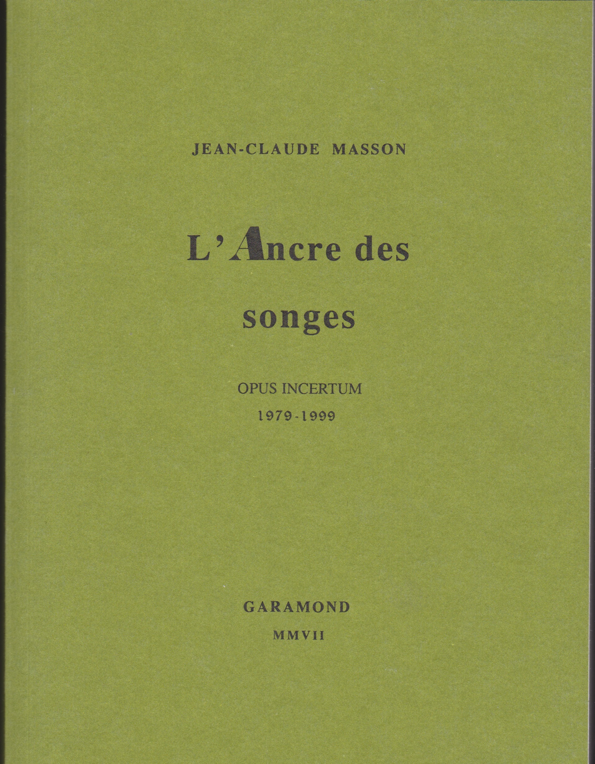 Publié en 2007, L'Ancre des songes, opus incertum (1979-1999) rassemble les œuvres poétiques de Jean-Claude Masson (Le Testament du printemps, Le Chantimane, Deux poèmes chiffrés, Un Sonnet crypté, Les Saisons Brûlées, La Mort du Baptiste, L'Alpha et l'oméga).
