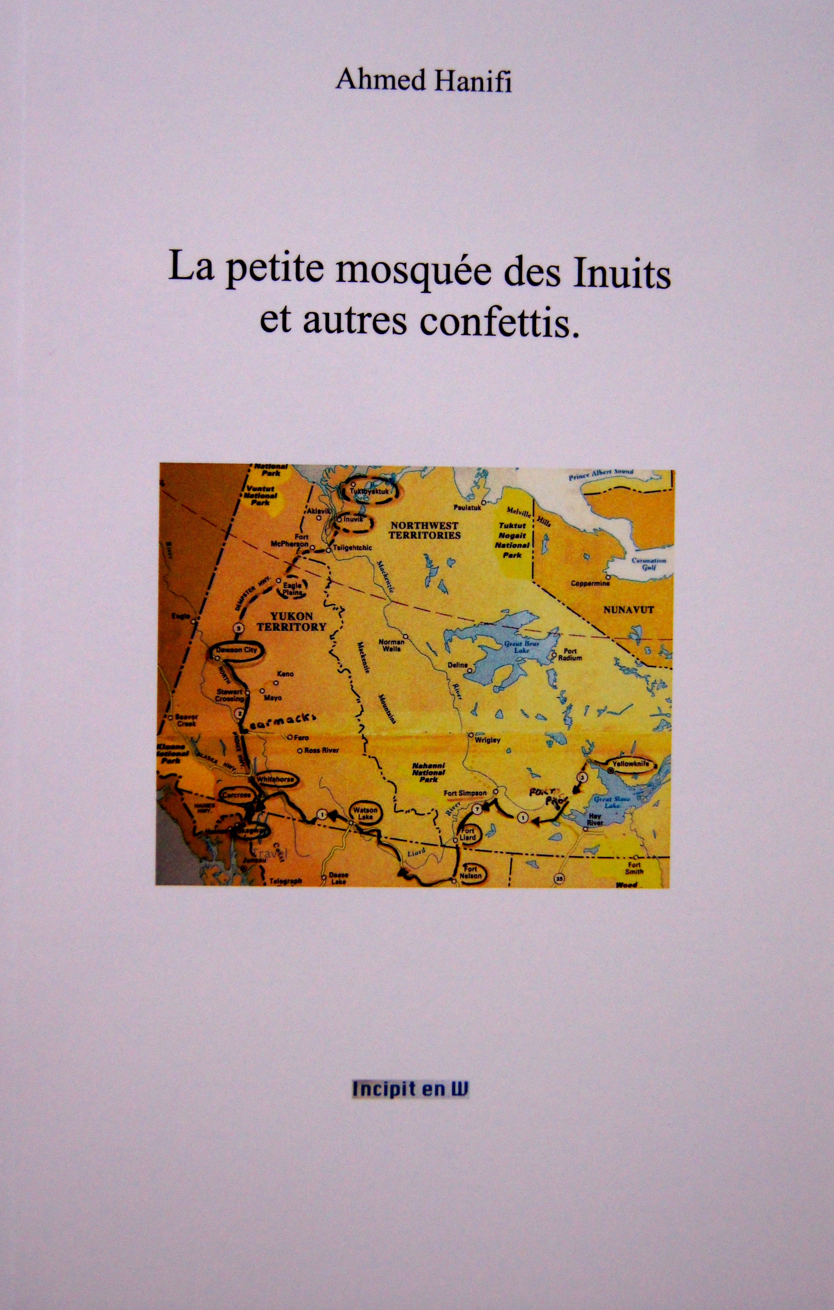 La petite mosquée des Inuits : Omar relut l’article puis chercha le village dans Google Earth. Il connaissait la capitale du Manitoba, mais il n’entendit jamais parler d’Inuvik… Il ne se doutait pas de la présence de musulmans en un endroit si éloigné, si isolé. Les jours suivants il se documenta davantage. Plus les jours et les semaines s’écoulaient, plus il s’attachait aux TNO, les Territoires du Grand Nord-Ouest canadien, cette région du bout du monde… Autres confettis: Un thé à El-Ouata : Le thé rouge que je déguste sous la tonnelle qu’ombragent de respectables bougainvilliers fleuris à faire rougir de lointains congénères mieux lotis, a le goût suave de l’immuabilité. Pour beaucoup ici la mesure du temps est une abstraction, une fantaisie étrangère dont on se moque éperdument… Gaston mon maître : Ces courbes qui ressemblaient à des arabesques, ces lettres qui, par leur enchaînement formaient des mots… étaient énigmatiques. La plupart me tenait à distance et cela je ne l’acceptais pas… Parce que je n’arrivais pas à lire ce que madame Congi, ma maîtresse, écrivait, mais aussi parce que je trouvais injuste que mon père ou que ma mère ne disposent pas de cette capacité à reproduire et à lire ces signes, pour toutes ces raisons-là, tel un forcené, j’avais décidé qu’il en serait autrement pour moi…