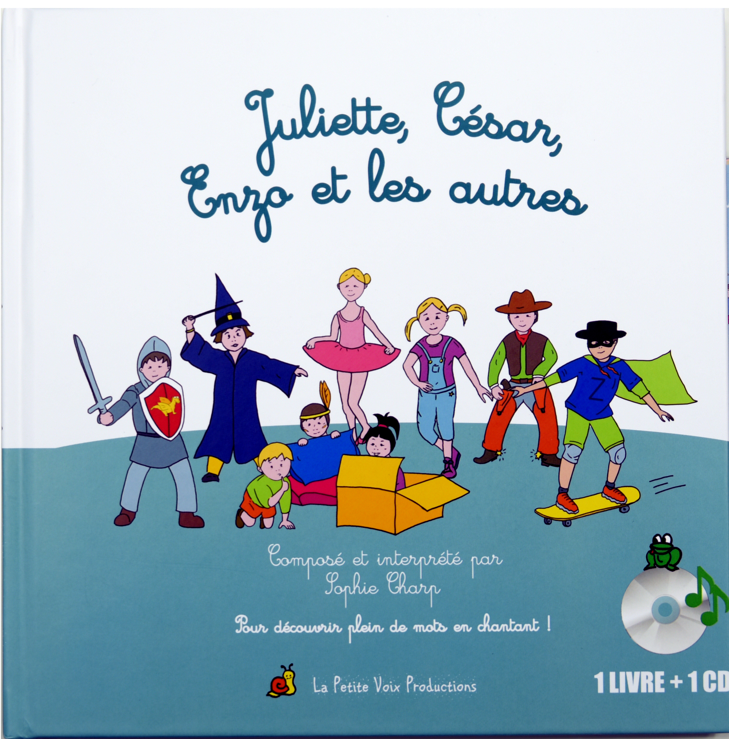 Album Livre + CD de chansons pour enfants de 4 à 7-8 ans Sorciers ou petit rat de l'opéra ? Espions ou chevaliers ? Pourquoi choisir ? Dans Juliette, César, Enzo et les autres... 11 chansons entraînantes et pétillantes nous parlent d'espions, de cowboys, d'opéra, de sorciers.. pour chanter, danser, et laisser place à l'imagination. Et quand les petits bouts seront fatigués d'avoir dansé dans le salon, ils pourront jouer avec les mots de leurs chansons préférées grâce au jeu de cartes à découper inséré dans le livret. Car Juliette, César, Enzo et les autres, c'est aussi un soupçon de pédagogie avec 11 chansons construites sur des rimes bien identifiées et riches en mots. (Les versions instrumentales sont incluses également.)
