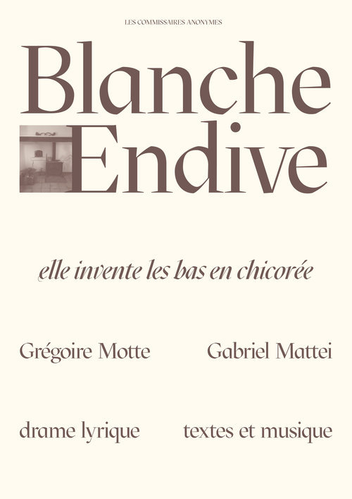 Blanche Endive a été écrit par le compositeur et chef d'orchestre Gabriel Mattei à partir d'un livret de l'artiste Grégoire Motte rédigé en parallèle à la composition musicale et en vers libres. Reprenant des thèmes centraux à l'imaginaire de Motte, la composition s'articule autour de quatre histoires entremêlées : l'invention des bas en chicorée (1942), l'histoire du troubadour Jaufré Rudel et de la Princesse lointaine, la transformation des bas de nylon en parachutes et le moulage raté d'une jambe de Miss Valenciennois.