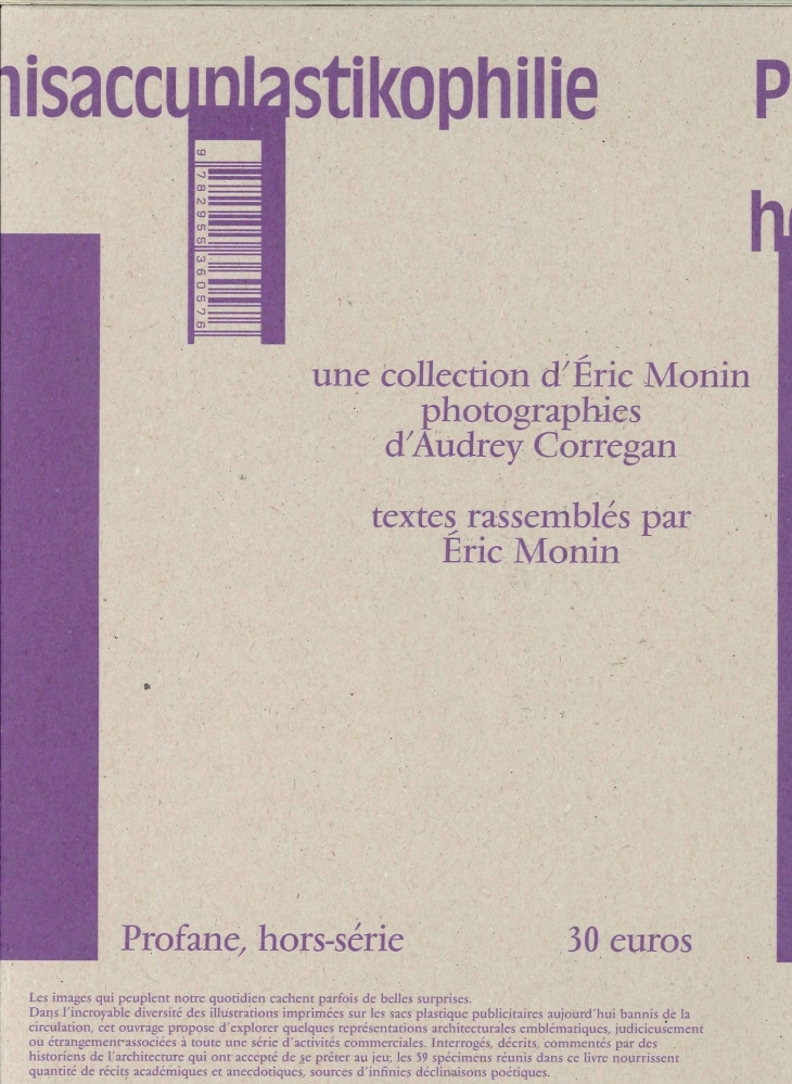 C'est ainsi que nous avons nommé cette collection de sacs plastique figurant des architectures: Archisaccuplastikophilie Fichés sur quelques centimètres carrés d'une pellicule de polyéthylène promise à l'alimentation de gros incinérateurs, les plus excellents bâtiments de France et bien d'autres encore, deviennent, sur ces pochons de pacotille, des merveilles insoupçonnées...Éric Monin est professeur d'histoire de l'architecture à l'École nationale supérieure d'architecture et de paysage de Lille. Depuis 20 ans, il conserve pieusement tout sac plastique qui représente un bâtiment. Au fil du temps, il a constitué ainsi une collection très particulière dont émerge une richesse imprévisible.