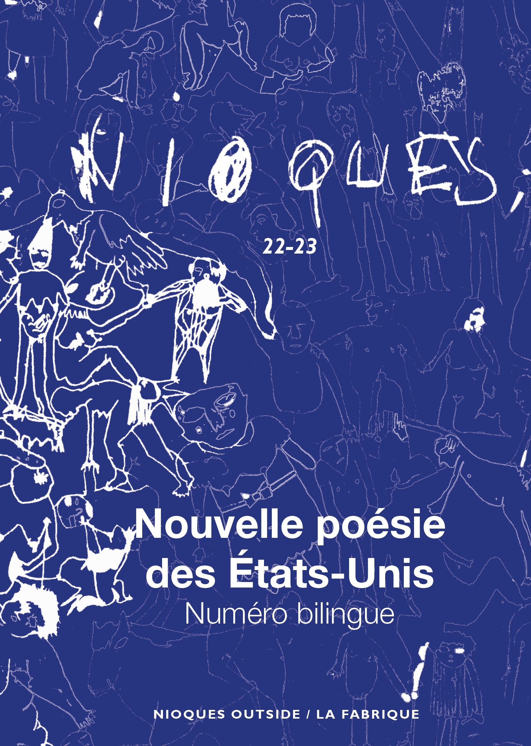 Nioques 22-23 Nouvelle poésie des Etats-Unis numéro bilingue Le collectif Double Change édite le numéro 22-23 sur la jeune poésie des États-Unis. Anthologie bilingue, ce numéro double présente une quinzaine de jeunes écrivains œuvrant dans les poétiques radicales et expérimentales du XXIe siècle, afin d’ausculter la façon dont les formes, les discours et les pratiques interrogent la poésie, jusqu’à sortir de celle-ci. La poésie postconceptuelle de Danny Snelson ou d’Allison Parish s’approprie des matériaux déjà existants sur le web et les « recycle », venant interroger la poétique du format, des programmes et des dispositifs numériques. L’interrogation sur ce qui est poétique dans les langues trouvées sur internet est aussi à l’œuvre dans ce qu’on pourrait appeler l’écrire-traduire de Monica de la Torre. Un même texte est traduit et retraduit selon diverses procédures qui génèrent du texte comme une mécanique. Elles questionnent ainsi les politiques de la langue en faisant boîter la poésie par la traduction tout autant que l’inscription de l’étranger dans la langue américaine. Ce sont des politiques de l’épreuve de l’étranger qu’explorent Youmna Challa, Lindsay Choi ou Mia You. D’autres poètes telles Sophia Le Fraga, Divya Victor, Layli Long Soldier minent la langue depuis des positions mouvantes qui vont de l’ironie à des textualités du quotidien, de la critique féministe à la position décoloniale. Nous avons aussi demandé à ces poètes – tous et toutes à peu près inconnus en France – de livrer un texte plus discursif sur leur pratique.