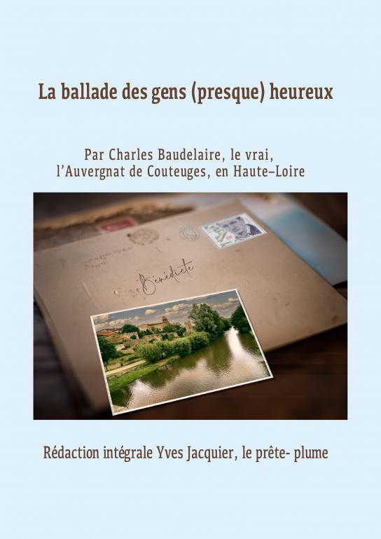 Synopsis roman ' La balade des gens (presque) heureux. Charles Baudelaire est né à Couteuges en Haute-Loire et rien ne prédestinait cet enfant sage à être mêlé un jour à une sordide histoire d'un cambriolage qui a mal tourné. Il y perdra 2 amis : Pierre-Jean, qui se jettera dans la Loire du pont de Vieille ? Brioude, Blaise, qui s'enfuira à l'étranger. La quête de Charles pour retrouver Blaise sera l'occasion de beaux voyages aux 4 coins du monde, racontés avec une plume iconoclaste. Ce roman, c'est aussi l'histoire de gens heureux...rafraîchissant dans ce monde tellement anxiogène ! C'est juste une belle histoire de gens que l'on a envie d'aimer et qui méritent qu'on les a...