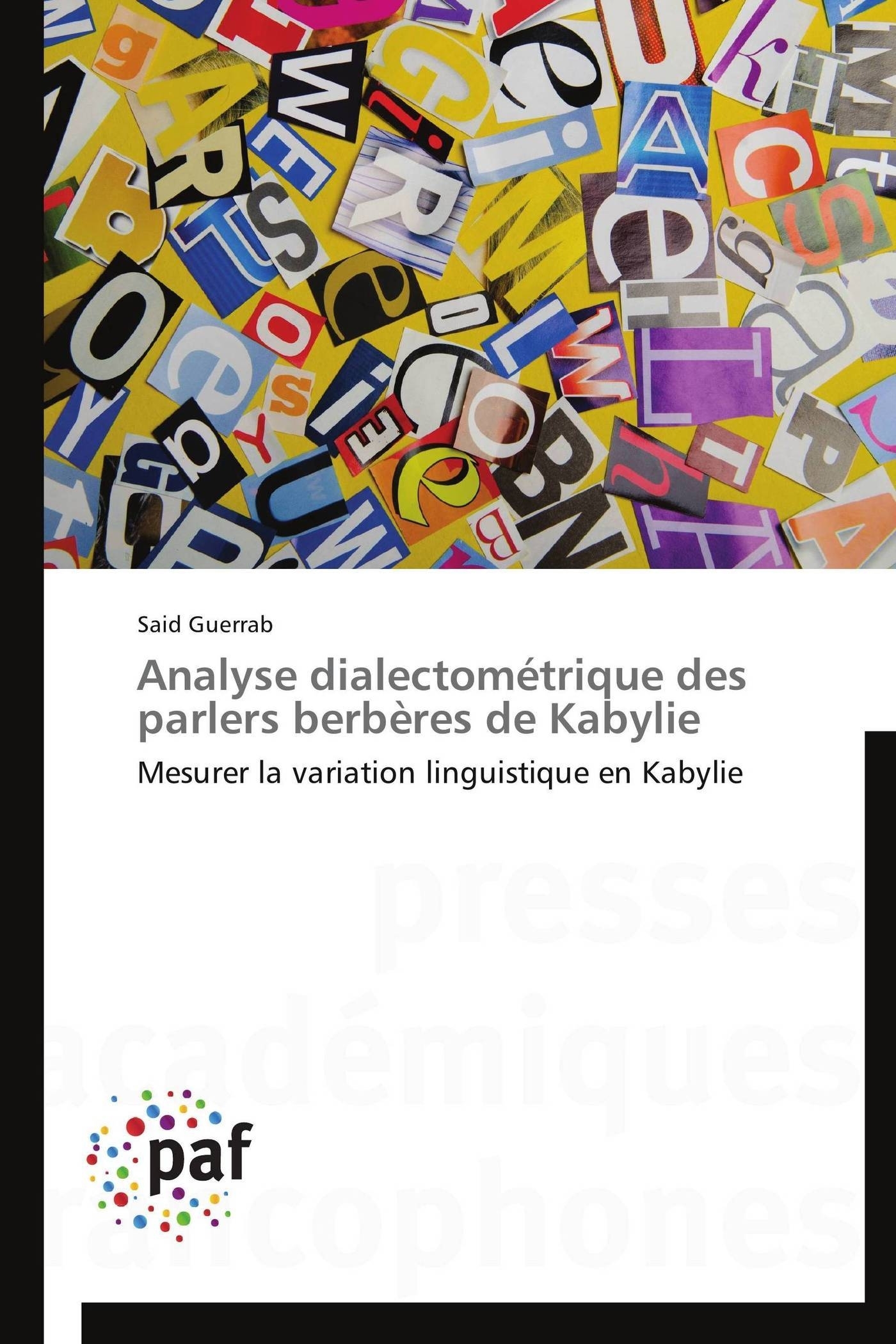 Il est difficile de parler du berbère sans parler de la variation. La variation existe aussi bien au niveau inter-dialectal qu'au niveau intra-dialectal. Pourtant, cette variation a rarement bénéficié d'une analyse systématique. Dans ce travail, nous nous sommes intéressés au kabyle, en effectuant une analyse dialectométrique sur un échantillon de 167 parlers qui couvrent une grande partie de la Kabylie. Le corpus analysé compte 130 entrées recueillies dans chacune des variétés prises en compte. Nous avons opté pour la méthode Levenshtein afin de calculer la distance entre les variantes. Nous avons choisi la méthode de Ward pour regrouper les variétés. Nous avons testé trois méthodes pour calculer la distance entre les sons : la méthode binaire, la distance d'Euclide et la distance de Manhattan. L'analyse des résultats nous a permis de montrer le continuum dialectal en Kabylie et de classifier les parlers kabyles en cinq zones infra-dialectales principales. Ce livre est destiné à toute personne intéressée par les méthodes de la dialectométrie. Il est aussi destiné à tout lecteur intéressé par la linguistique berbère en général et kabyle en particulier.