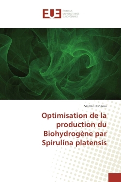 Le travail de recherche présent dans cet ouvrage concerne le développement de cultures d'une cyanobactérie: Spirulina platensis recueillie sous forme de pommade d'un marais du sud Algérien est revivifiée dans le milieu de culture Zarrouk afin de produire l'hydrogène grâce à son enzyme «hydrogènase». Cette capacité de production d'hydrogène est optimisé sous l'effet des différentes conditions opératoires, de la composition du milieu ainsi que l'effet de la forme du photobioréacteur. A travers ce travail, on a pu constater qu'au cours de la phase exponentielle de la croissance de notre souche, la vitesse spécifique de croissance (µ) est de 0, 07 j-1, le pH optimal pour la production d'hydrogène est de 8,5 et l'intensité lumineuse de 2000 Lux à une concentration de biomasse de 1,5 g/L. Les meilleurs taux de production de H2 sont obtenus pour les photobioréacteurs de forme conique- plat. La mixotrophie n'a pas un effet significatif sur la production d'hydrogène sauf dans le cas du D-glucose qui a presque doublé la productivité. La pré- incubation induit une forte accumulation du glycogène endogène chez notre souche mais elle est en défaveur à la production d'hydrogène.