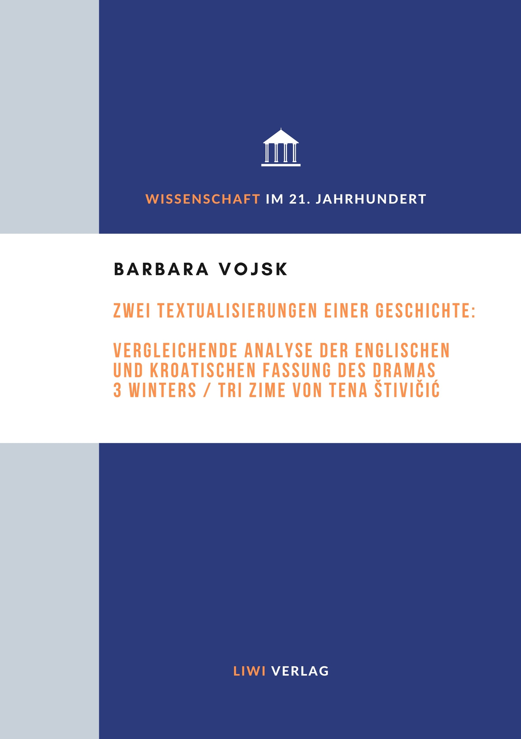 "Warum wird ein Drama, das über die Geschichte einer kroatischen Familie handelt, sowohl auf der Bühne in London als auch in Zagreb so positiv aufgenommen? Laut Iser kommt die Bedeutung eines Textes erst im Vorgang der Rezeption zustande. Da der Leser bzw. Zuschauer über bestimmte gruppenspezifische Erfahrungen verfügt, ist die Interpretation des literarischen Werks ausgeprägt sozial und historisch bedingt. Berücksichtigt der Dramentext die Spezifika der Kulturräume seiner impliziten Rezipienten? Wenn ja, welche Abweichungen gibt es dadurch zwischen den Textvorlagen für die Aufführungen in englischer und kroatischer Sprache? In der vorliegenden Arbeit werden die Ähnlichkeiten und vor allem die Unterschiede zwischen den zwei Fassungen analysiert. Mit diesem Vergleich wird versucht, die Hypothese zu überprüfen, dass es sich dabei nicht um eine reine Übersetzung handelt, sondern um zwei Textualisierungen einer Geschichte." Aus dem Inhalt: Das gegenwärtige europäische und kroatische Drama Die Rückkehr zur Geschichte und dem Autor Das kroatische Drama als brand? Neue Sensibilität mittels eines europäischen kollektiven Gedächtnisses Tena Štivičić - Autorin zwischen zwei Kulturräumen Familiensaga in der stürmischen Geschichte Erstaufführungen und Kritika Analyse: Štivičić' Drama in englischer und kroatischer Fassung Diskussion: Familie Kos als Träger des kommunikativen Gedächtnisses Diskussion: 3 Winters /Tri zime als Medium des kollektiven Gedächtnisses Barbara Vojsk. Zwei Textualisierungen einer Geschichte: Vergleichende Analyse der englischen und kroatischen Fassung des Dramas 3 Winters / Tri zime von Tena Stivicic. Zugleich: Abschlussarbeit im Rahmen der Prüfung für den Master Slavische Philologie an der Georg-August-Universität Göttingen am 15.08.2019 Erschienen in der Reihe: Wissenschaft im 21. Jahrhundert, Band 1. Neuausgabe, LIWI Verlag, Göttingen 2020. LIWI Literatur- und Wissenschaftsverlag