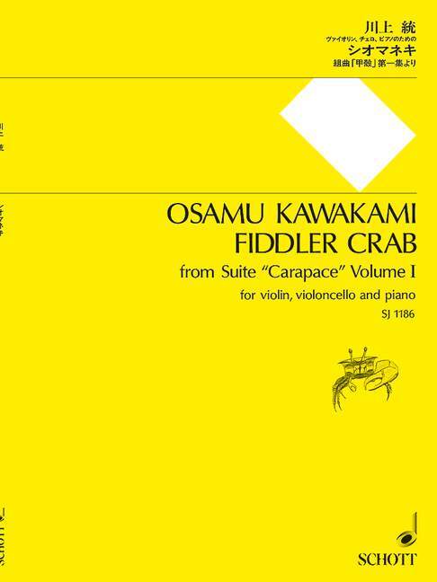 Osamu Kawakami's Suite "Carapace" for piano trio has been available from Schott Music. His music is notable for its fresh perspective and sense of marvel. Suite "Carapace" consists of 15 pieces composed between 2005 and 2015 collected chronologically in three volumes. The first of these volumes includes three works composed and premiered at Tokyo College of Music in 2005, Horseshoe Crab, Odontodactylus japonicus, and Fiddler Crab, and two works composed in 2007 and premiered at Yokosuka City Culture Hall, Pistol Shrimp and Japanese Spider Crab. Each of the works in this volume was inspired by the name or appearance of a particular carapace, as suggested by the titles. Through the music, we are able to examine each creature in detail with a variety of characteristic rhythms and harmonies arising from the composer's deep interest and imagination.