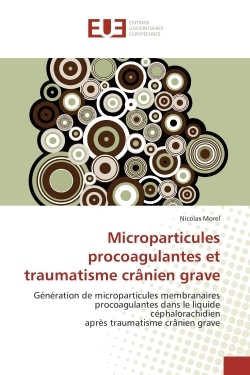 Le traumatisme crânien (TC) s'accompagne de lésions cérébrales associées à l'apoptose neuronale. Ce mécanisme de mort cellulaire programmée est caractérisé par un remaniement membranaire conduisant à la libération de microparticules (MP) . Objectif: mettre en évidence au cours du TC sévère, la génération de MP au niveau du LCR et dans le compartiment vasculaire. Résultats : 16 patients âgés de 27 ans ± 11 présentant un traumatisme crânien sévère ont été inclus dans l'étude. Des taux élevés de MP sont retrouvés à J0 dans le LCR des sujets traumatisés crâniens en comparaison aux valeurs mesurées chez 6 patients hospitalisés en réanimation pour des pathologies autres que le TC (médiane = 4,98 [Q1 = 3,28 ; Q3 = 6] vs 0,86[0,7 ; 1,09] ; p = 10-2). De même des taux élevés de microparticules sont retrouvés dans le sang à J0 en comparaison aux valeurs mesurées chez 50 volontaires sains (4.15 ± 3.7 vs. 2.3 ± 0.1 nM PhtdSEr Eq. ; p = 0.02). Conclusion : Il existe au cours du TC une activation cellulaire et plaquettaire intense marquée par la génération de MP procoagulantes dans le LCR. Cette activation cellulaire décroît à distance du TC.