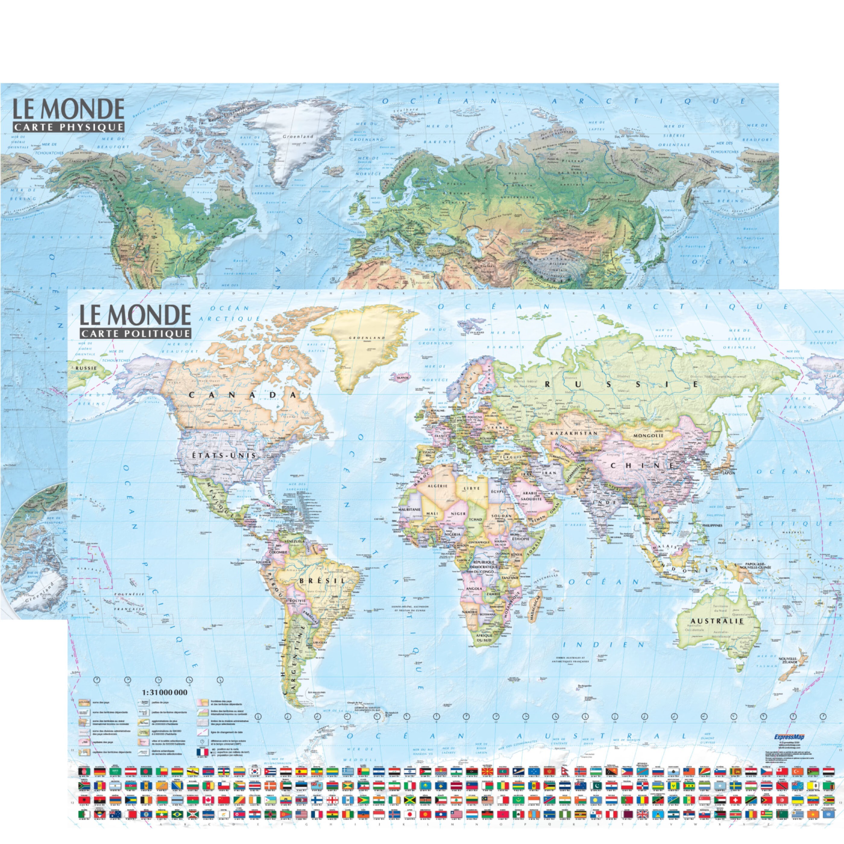 ExpressMap, maison d’édition spécialisée dans le tourisme, vous propose des cartes murales élaborées par des cartographes expérimentés, parfaites pout tout intérieur : bureau, maison, classe. Elles se distinguent par leur haute qualité, leur précision et leur lisibilité. La carte du monde recto-verso au format poster présente : une face politique et une face physique. Grâce à ses faces laminées, la carte est très résistante et indéchirable. Livrée roulée dans un tube rigide. Le recto présente la carte politique du monde : - pays et territoires dépendants avec les capitales ; - villes importantes ; - drapeaux de tous les pays avec leurs emplacements sur la carte ; - ombrages délicats du relief de la Terre et des fonds marins. Le verso présente la carte physique du monde : - l’emplacement des forêts tropicales, steppes et déserts, toundras, sommets, cols, caps importants ; - descriptions des chaînes de montagnes, des plaines, des plateaux et d’autres types de reliefs ; - descriptions des océans, des mers, des lacs, des rivières et d’autres éléments hydrographiques ; - en supplément, les plans des régions polaires ; - la technique du relief ombré de la Terre et les fonds marins permet de se rendre compte de la surface de notre planète.