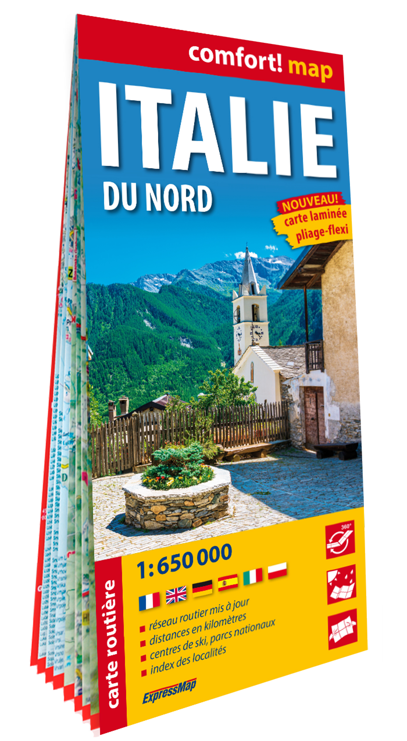 Carte laminée d’Italie nord-centrale à l’échelle 1 : 650 000, détaillée et lisible, avec le réseau routier mis à jour. Elle se plie facilement dans tous les sens et est imperméable. Elle contient l’index des localités. Les atouts de la carte : - carte routière et touristique à l’échelle 1 : 650 000 ; - numérotation et catégorisation détaillées des routes ; - stations de ski et remontées mécaniques ; - lisibilité optimale des reliefs, des forêts, des parcs nationaux ; - descriptions des chaînes de montagnes, des sommets, des cols principaux, etc. ; - index des localités ; - laminées recto verso.