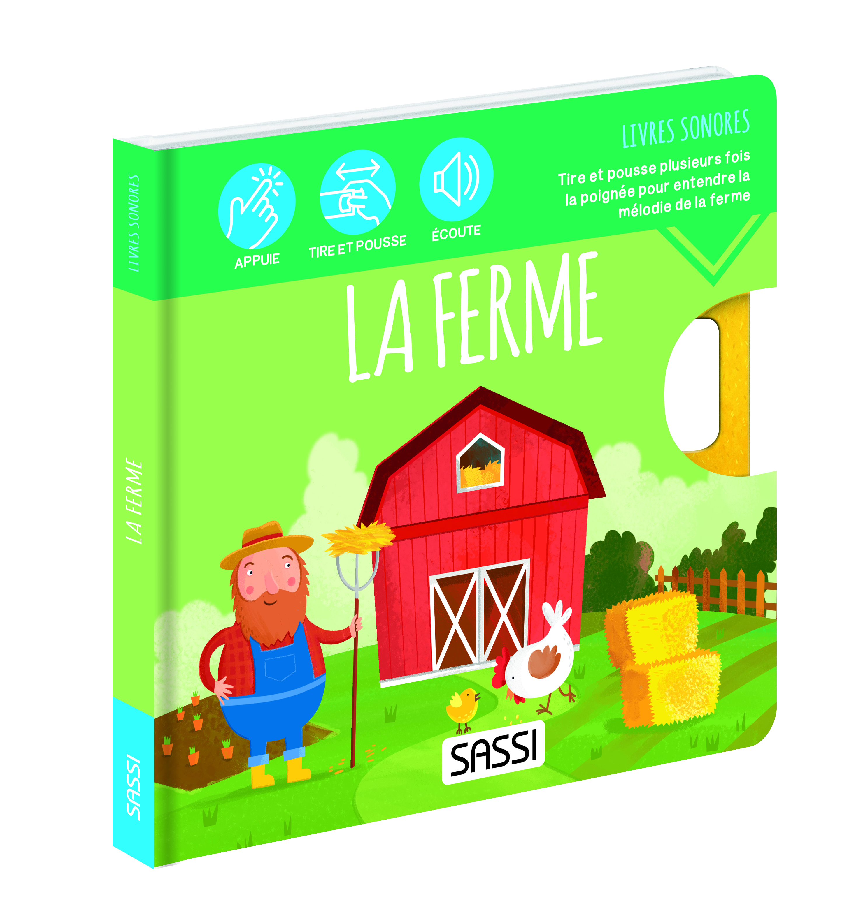 Un livre sonore pour apprendre à associer les images aux sons et stimuler l'apprentissage. Voici les petits animaux de la ferme. Lis leurs aventures, appuie sur les boutons et apprends à reconnaître leurs cris. Tire et pousse la poignée : une douce mélodie accompagnera ta lecture.