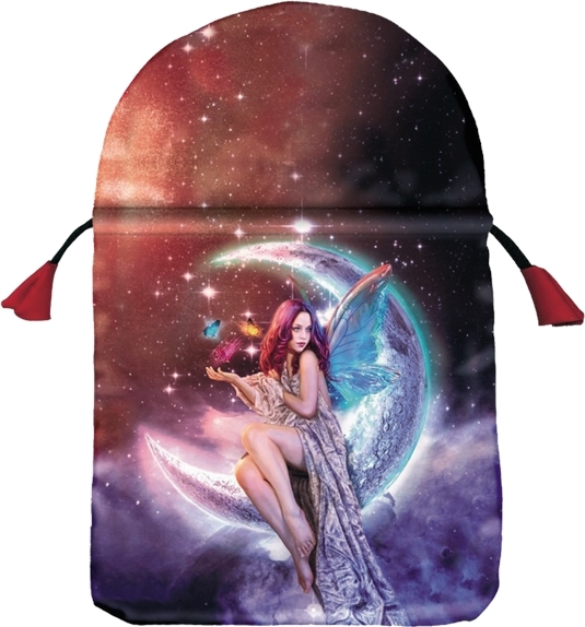 Bourse en satin imprimée avec la fée de la Lune, dessinée par Raffaele De Angelis : une puissante petite fée pour votre jeu de Tarot. L'alliance entre la poussière de Lune et la magie des fées, une protection idéale pour vos plus précieux jeux de Tarot. Dimensions : 15,3 x 23 cm.
