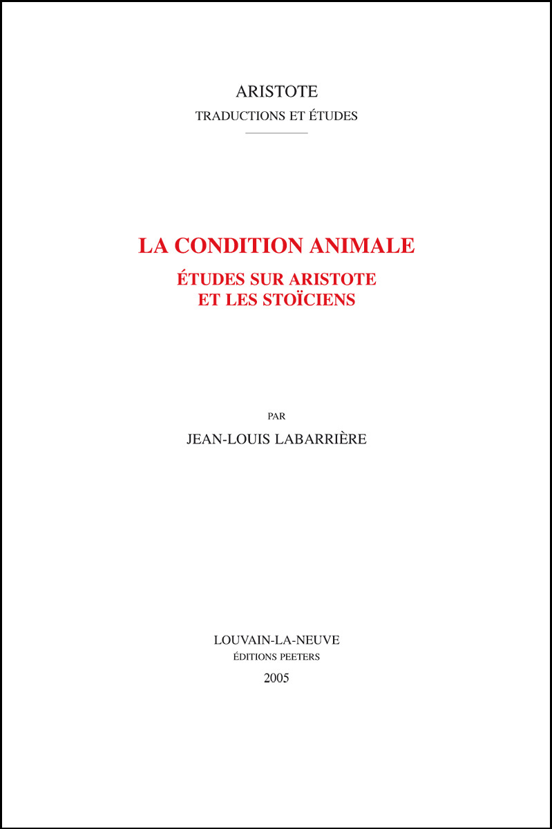 LA CONDITION ANIMALE ETUDES SUR ARISTOTE ET LES STOICIENS