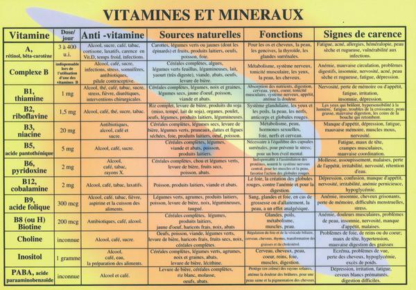Sous forme de tableau, nous trouvons pour l’ensemble des vitamines et minéraux : la dose quotidienne conseillée, l’anti-vitamine (ou l’anti-minéral), les sources naturelles (boissons ou aliments contenant cette vitamine ou ce minéral), les fonctions ou propriétés sur le plan de la santé et les signes caractérisant une carence.